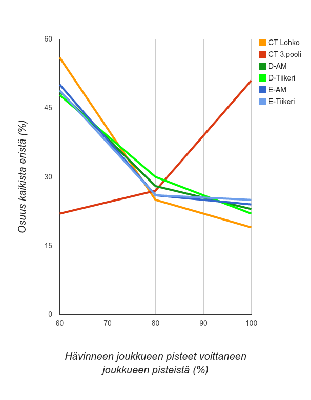 Erittäin epätasainen erä = vastustaja sai 0%-60% (esim. 25-14 tai vähemmän)