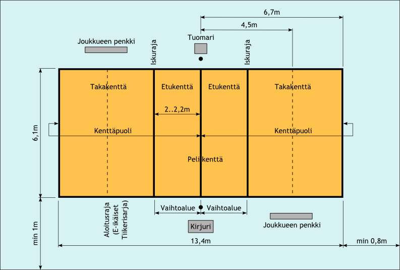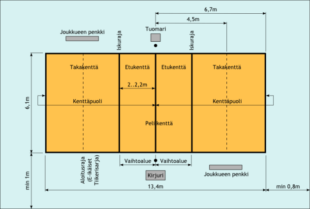 Pelikentän pituus on 13,4 m ja leveys 6,1 m. Iskurajan etäisyys on 2 – 2,2 m keskilinjasta. Pelikenttää rajoittavat 5 cm:n levyiset rajat. Myös keski- ja iskurajat ovat 5 cm:n levyiset.