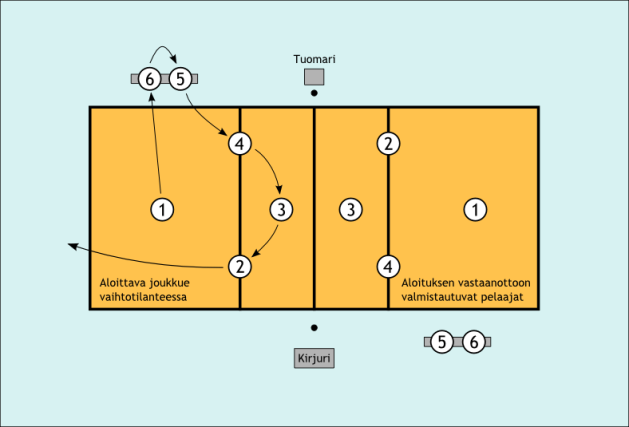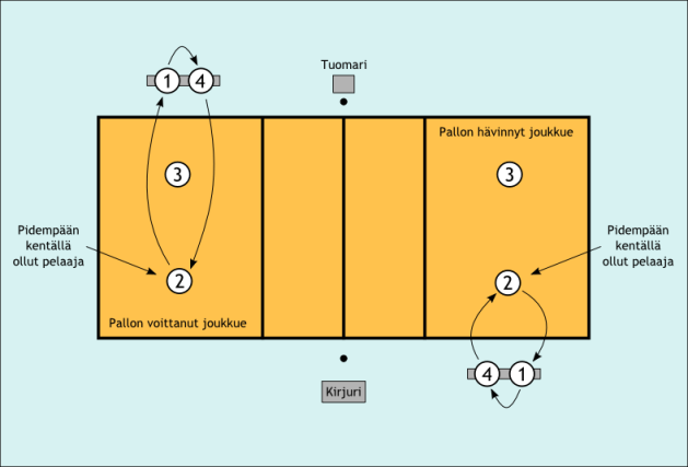 Pallot pelataan loppuun asti ja jokaisen pelatun pallon jälkeen molemmissa joukkueissa tapahtuu kiertovaihto. Pidempään kentällä ollut pelaaja lähtee pois ja uusi pelaaja tulee tilalle (kuva 5). Erän ensimmäisen pelatun pallon jälkeen joukkue itse sopii, kumpi pelaajista tulee pois kentältä. Tämän jälkeen pelaajien kiertojärjestys säilyy samana koko erän ajan. Kun joukkue voittaa pallon, on aloitusvuoro pelaajalla, joka ei siinä pallossa osallistu kiertovaihtoon.