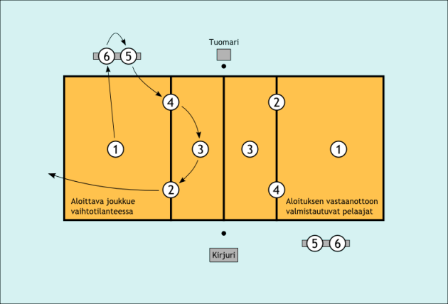 - Samalla tavalla erän loppuun, eli aina kahden pelatun pisteen jälkeen aloitussyöttövuoro vaihtuu toiselle joukkueelle, joka tekee kiertovaihdon ennen syöttövuoronsa aloittamista.