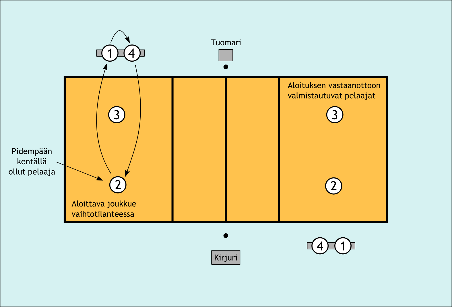 Pallot pelataan loppuun asti. Se joukkue kumpi syöttää seuraavaksi suorittaa kiertovaihdon ja edellisen pallon syöttänyt joukkue ei tee kiertovaihtoa. Pidempään kentällä ollut pelaaja lähtee pois ja uusi pelaaja tulee tilalle (kuva 5). Erän ensimmäistä kiertovaihtoa tehtäessä joukkue itse sopii, kumpi pelaajista tulee pois kentältä. Tämän jälkeen pelaajien kiertojärjestys säilyy samana koko erän ajan. Kun joukkueelle tulee syöttövuoro, on aloitusvuoro pelaajalla, joka jää kentälle toisen pelaajan mennessä kiertovaihtoon.