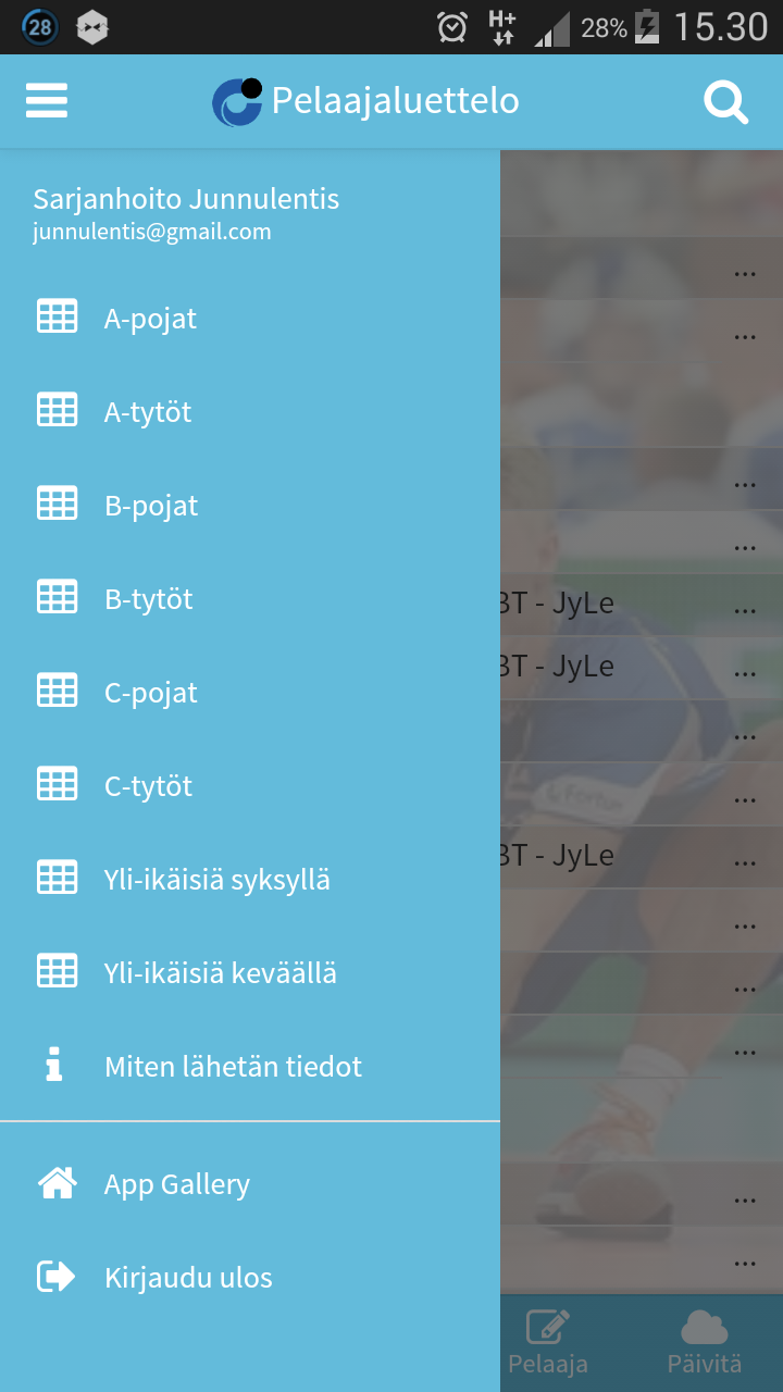 Appsin alamenussa olevasta ”Päivitä”-painikkeesta saat päivitettyä tietokannan tiedot omaan puhelimeen tai tietokoneelle. Tietojen tallentamisen yhteydessä tämä tapahtuu automaattisesti, mutta esim. jos katsot tietoja huomenna ja joku muu on lähettänyt sen jälkeen uusia joukkue-/pelaajatietoja Junnulentikseen, ne näkyvät vasta, kun painat Appsin ”Päivitä”-painiketta. Siihen asti tiedot ovat vanhoja selaimessa olevia tietoja.