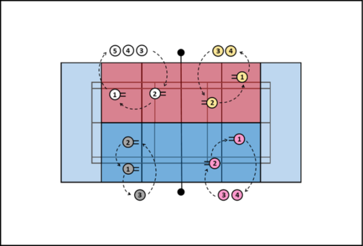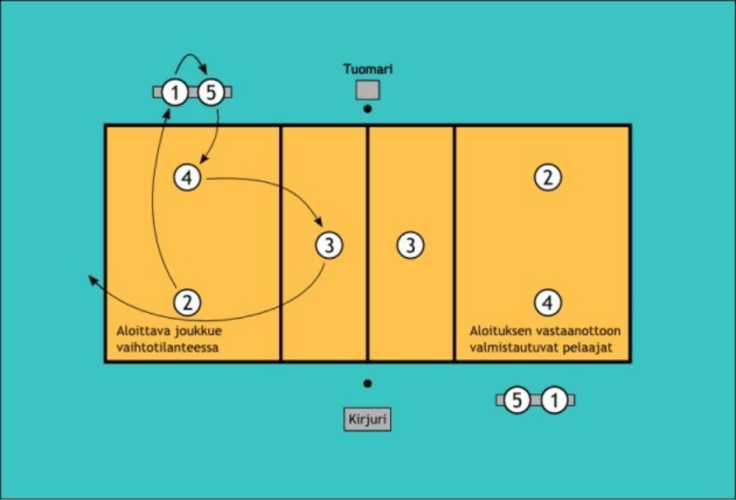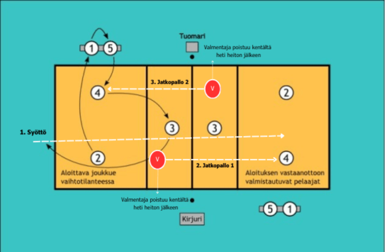 - Pallo heitetään takakentän vasemman puolen pelaajalle (kuva 2 paikka 4). Jos näin ei tapahdu, tilanne uusitaan.